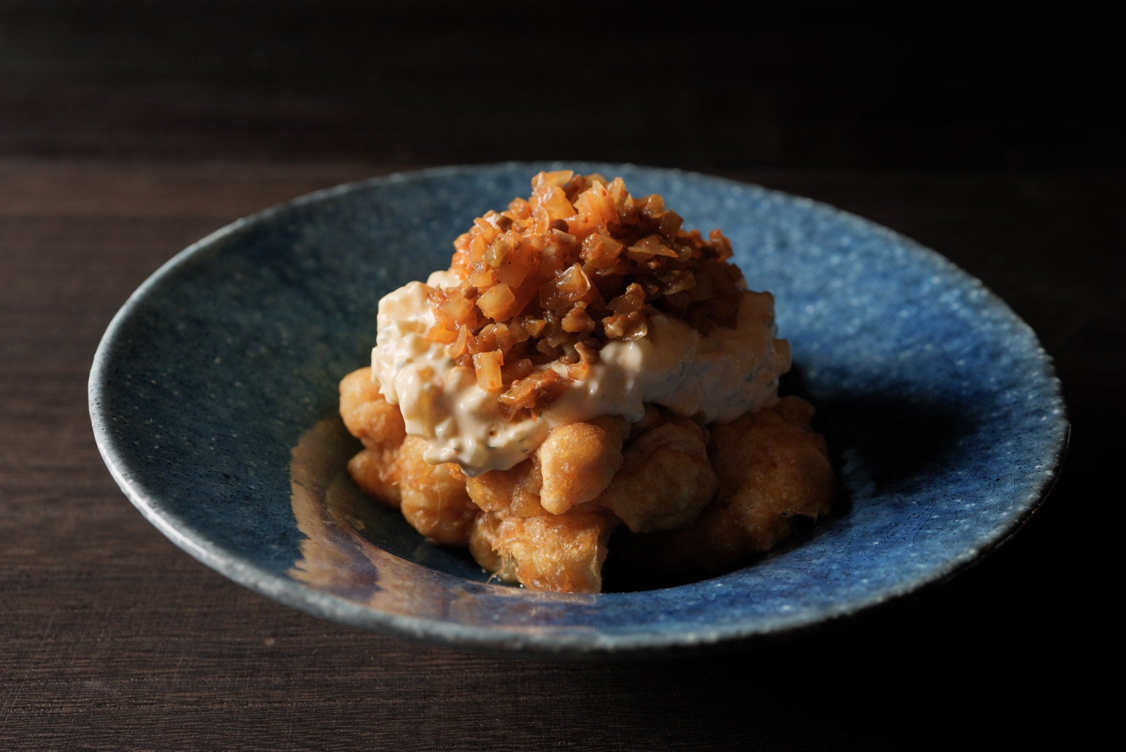 こだわり卵「塚だま®」をゆでるところから店で仕込んでいるコク深いタルタルソースの上に、食欲の湧く刺激的なガラムマサラに鹿児島産の白宝らっきょうを合わせたカレー風味の具材ゴロゴロの調味料を載せています。横綱級にマッチする組み合わせです。