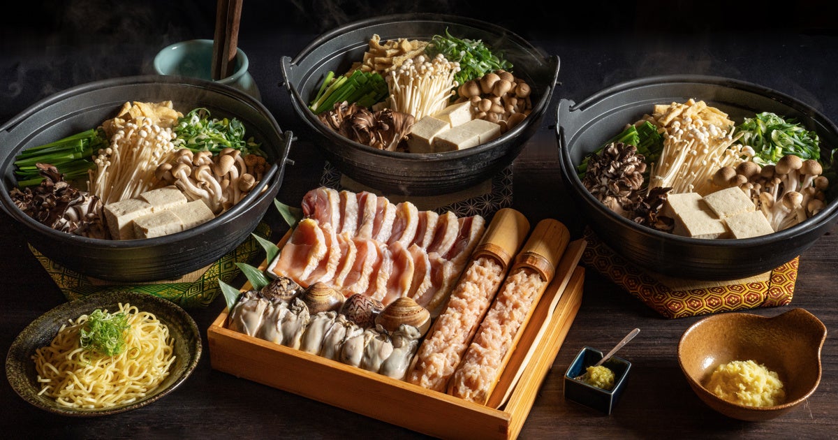 地鶏(ムネ・モモの薄切り、生つくね)ハマグリ、広島産カキ、黒舞茸、シメジ、エノキ、ニラ、九条ネギ、白ネギ、油揚げ、白菜、とうふ、薬味、シメ(ラーメン/うどん/雑炊)