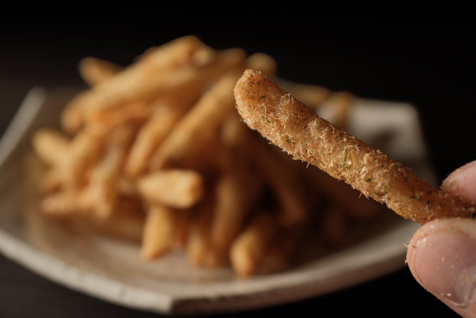 うまみと香りの高さに定評のある枕崎産の鰹けずり節と、宮崎県のシーズニングソルトの代表格「マキシマム」をまとったポテトフライです。