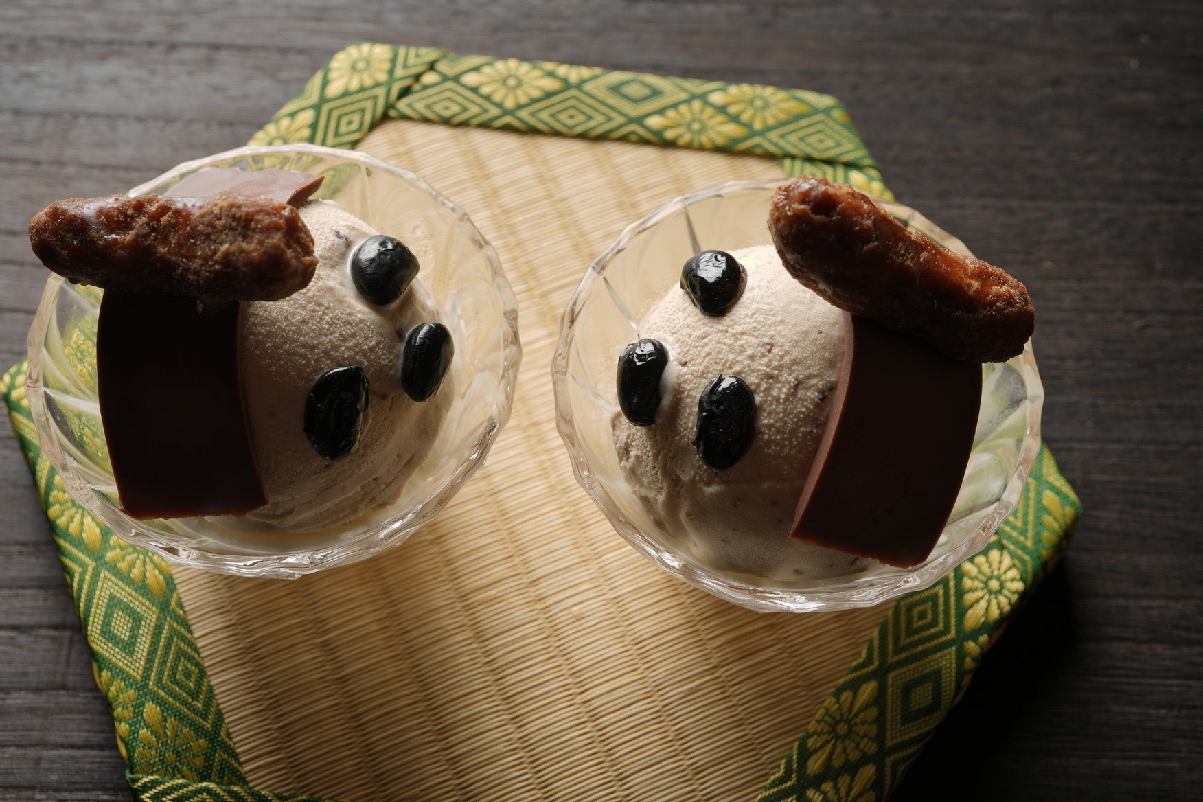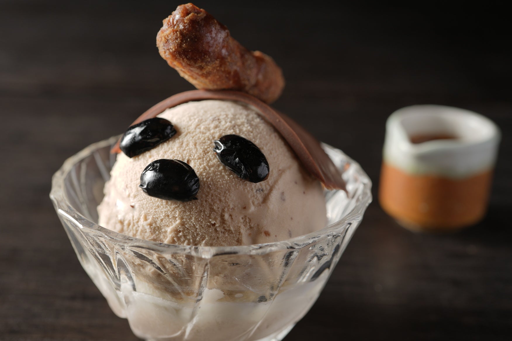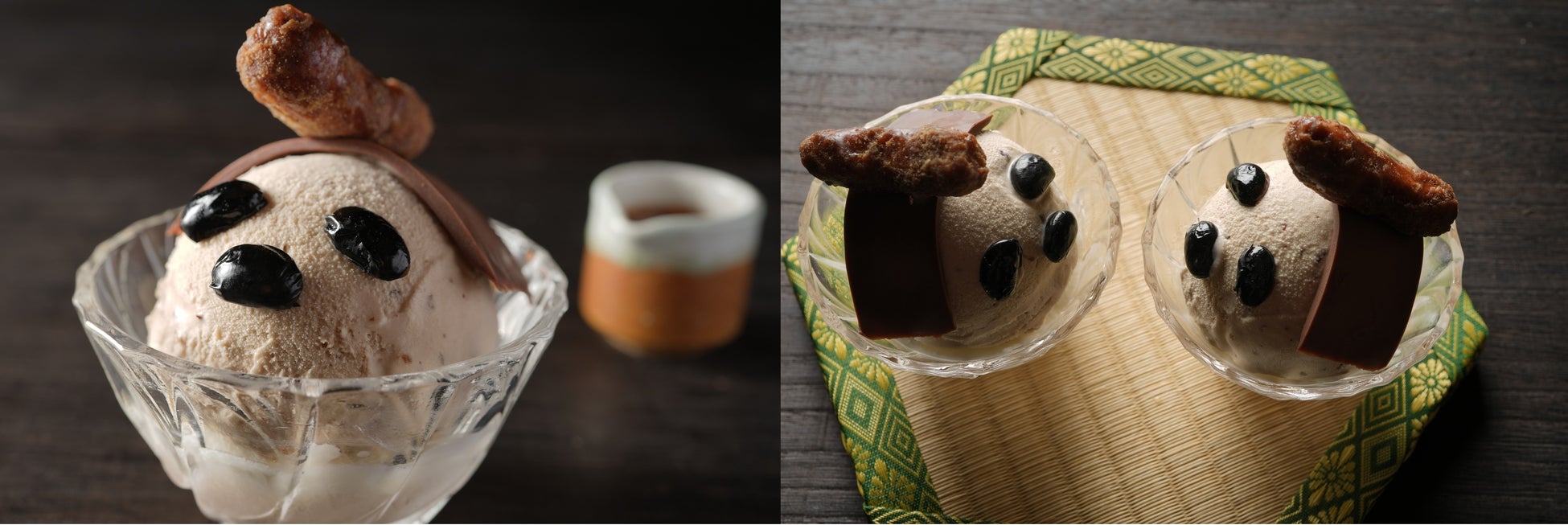 渋皮入りの栗アイスを使った秋の「白くま」にチョコレートの「 鬢(びん)」とかりんとうの「髷(まげ)」を付けました。