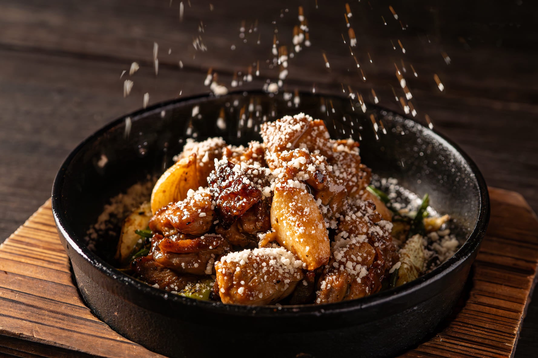十勝地方で生産している脂スッキリな「新得地鶏」を炭火焼にし、力士みそを絡めてお持ちします。卓上仕上げに、「清めの塩」に見立てた粉チーズを撒きかけます。鉄板の上でおいしく焼けた九条ネギと共にお召し上がりください。