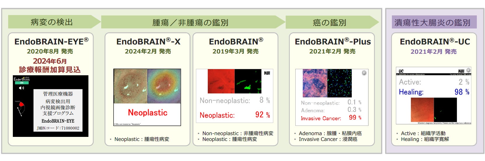 「EndoBRAIN」シリーズは、大腸内視鏡における病変の検出・鑑別から治療方法の選択までの一連の工程をAIで包括的に支援し、医師の診療を補助するソフトウェア群です。