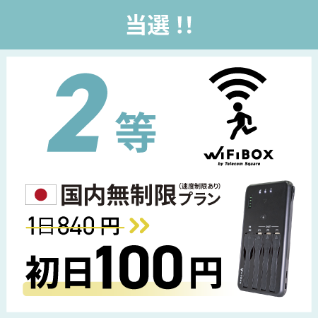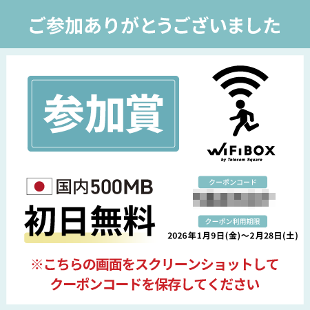 参加賞 WiFiBOX日本国内 500MBプラン初日無料クーポン:1等から3等に当選されなかった方