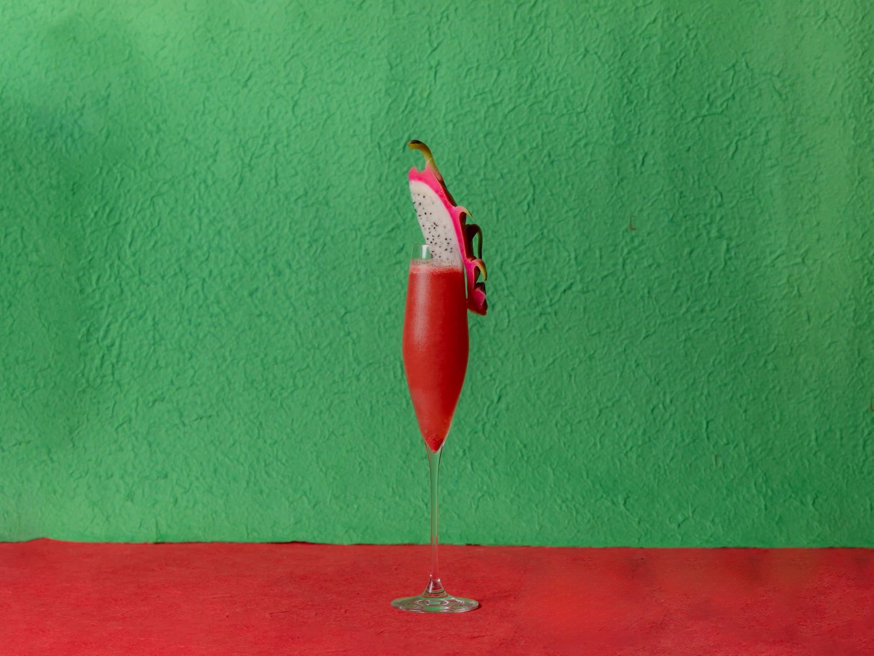 いちごと月桃シロップを合わせ、スパークリングワインで仕上げた、甘く飲みやすいカクテル。