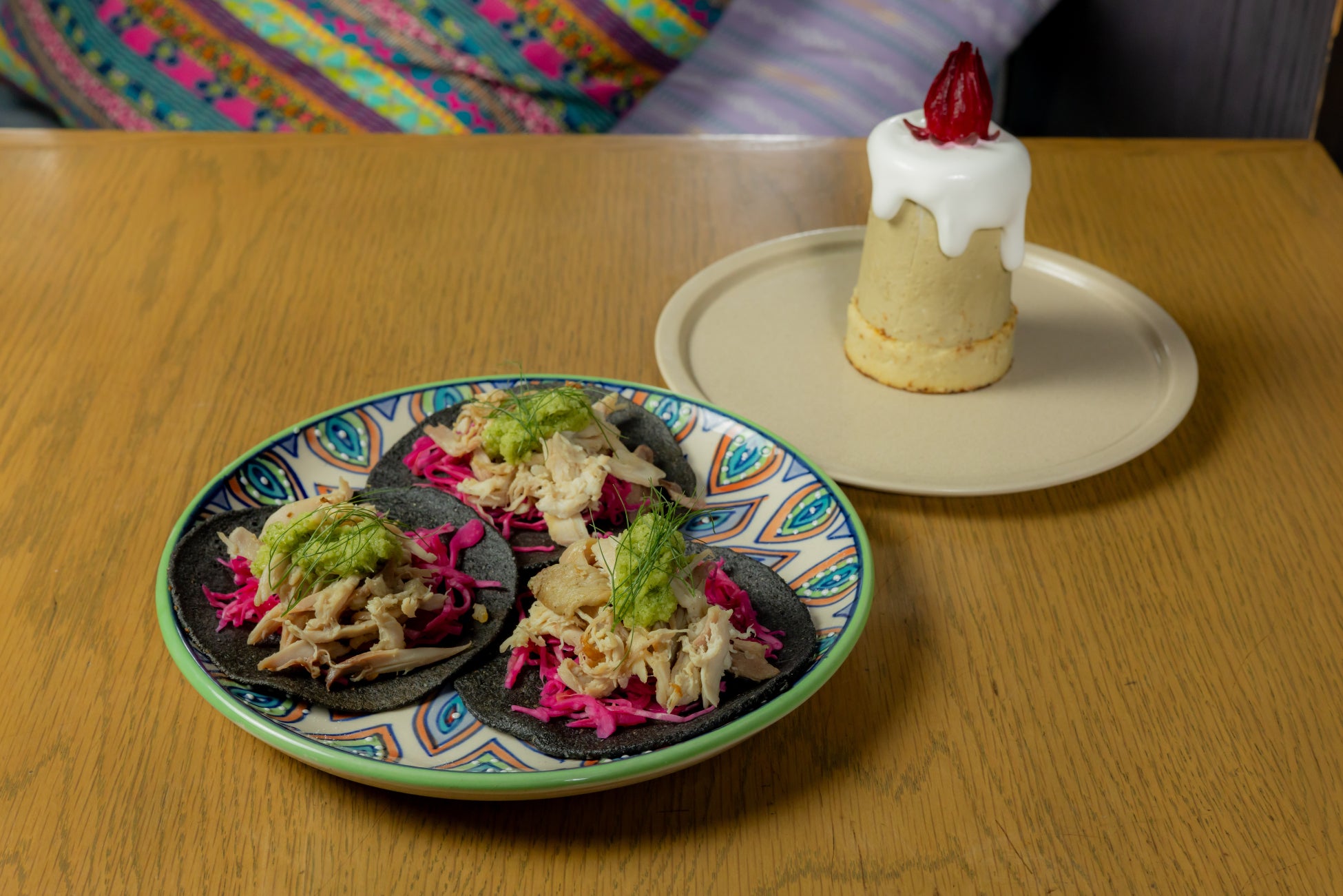 イーチョーバー(フェンネル)、ピパーチ(島胡椒)でマリネしたローストチキンのタコス。