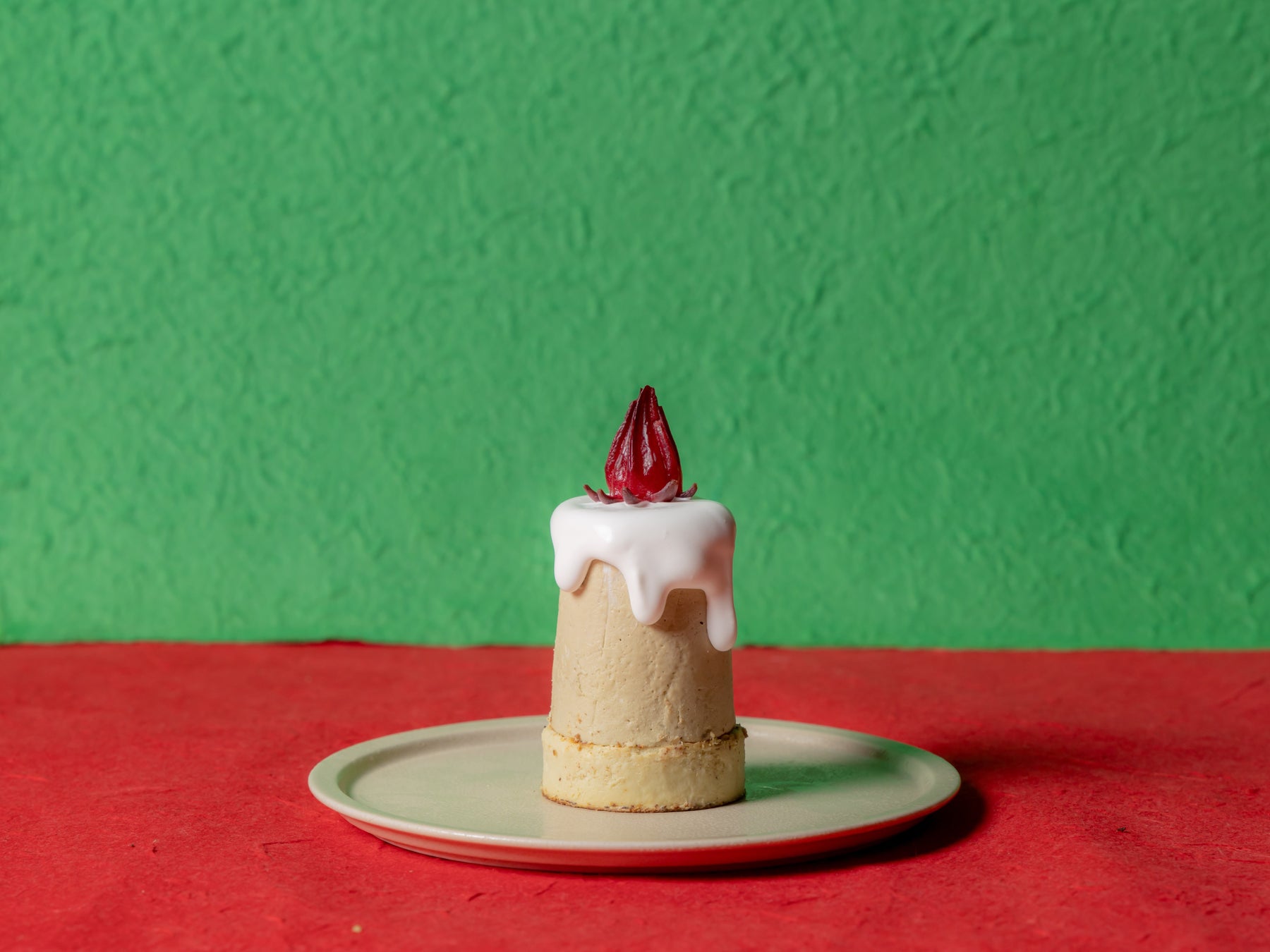 沖縄のニシヨモギ「フーチバー」を練り込んだ爽やかな風味の2種のチーズケーキに、月桃で香り付けした特製クリームを添え、キャンドル部分にはルビーカラーのローゼル(別名:食用ハイビスカス)をあしらい、ローソクの灯を表現しました。フ―チバ―とチーズの意外な組み合わせが生み出す、奥深い風味を楽しめます。沖縄ならではの素材の魅力を味わいながら、クリスマス気分をお楽しみください。
