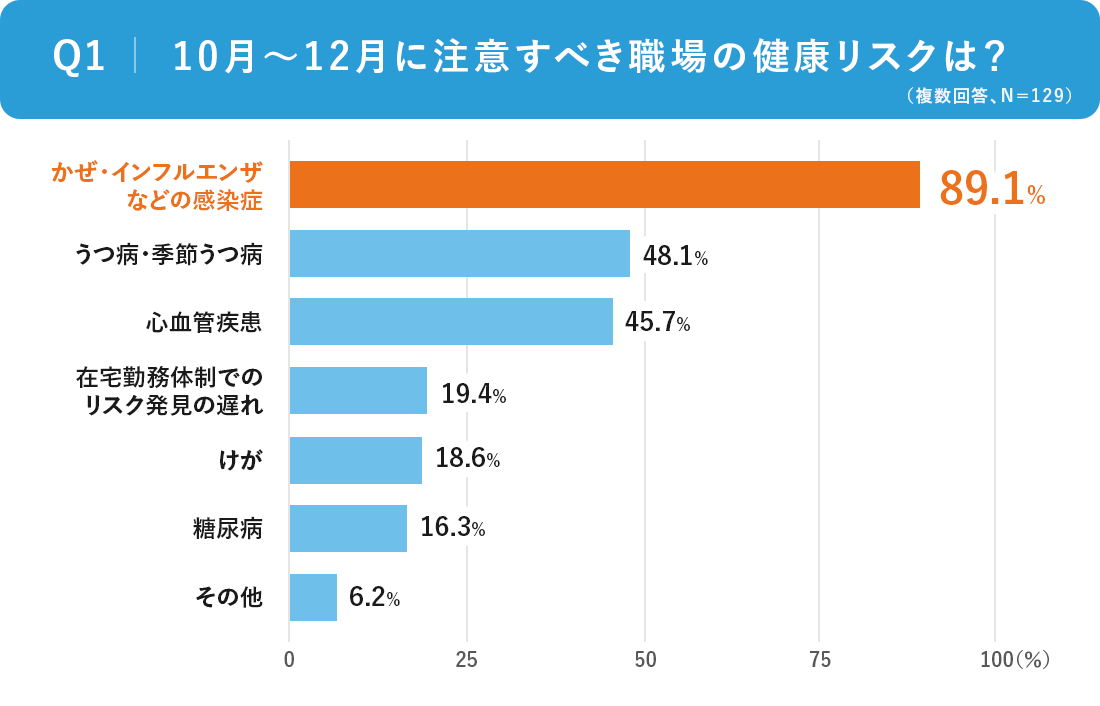 【産業医129名が回答】10月~12月職場の健康リスク約9割が「かぜ・インフルエンザなどの感染症」と回答
