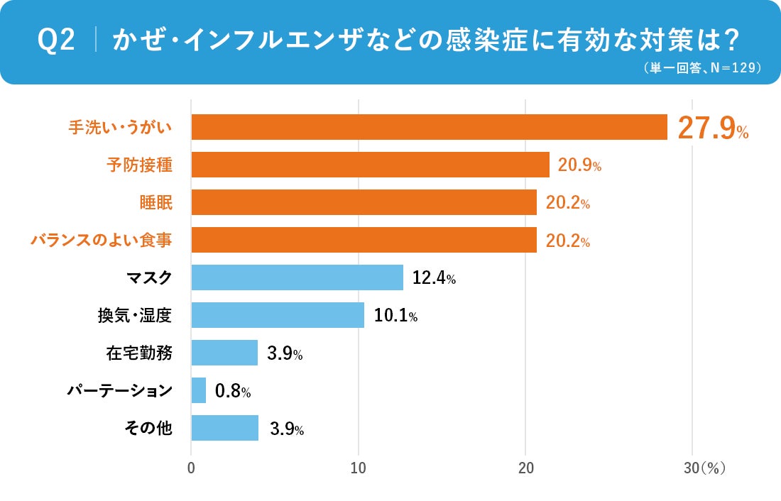 その結果、「かぜ・インフルエンザなどの感染症(89.1%)」が約9割でトップになりました。さらに、「かぜ・インフルエンザなどの感染症」に有効な対策については「手洗い・うがい(27.9%)」、「予防接種(20.9%)」「睡眠(20.2%)」「バランスのよい食事(20.2%)」となっています。
