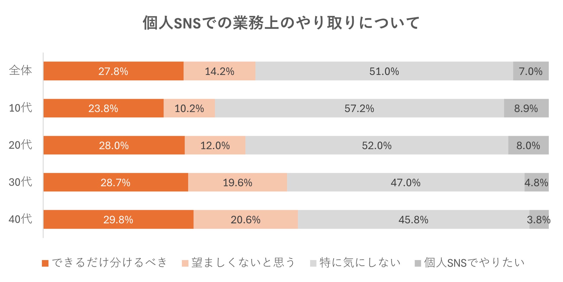 ・10代では「SNSは個人的な繋がりの人のみに留めておきたいから」(42.9%)が1位で、「自分のプライベートな一面を見られることに抵抗があるから」と「プライベートな時間に仕事の連絡が来ることを避けたいから」(各39.0%)が同率2位に。時間外の連絡有無以前に個人SNSで仕事のつながりを持ちたくない傾向が浮き彫りとなった