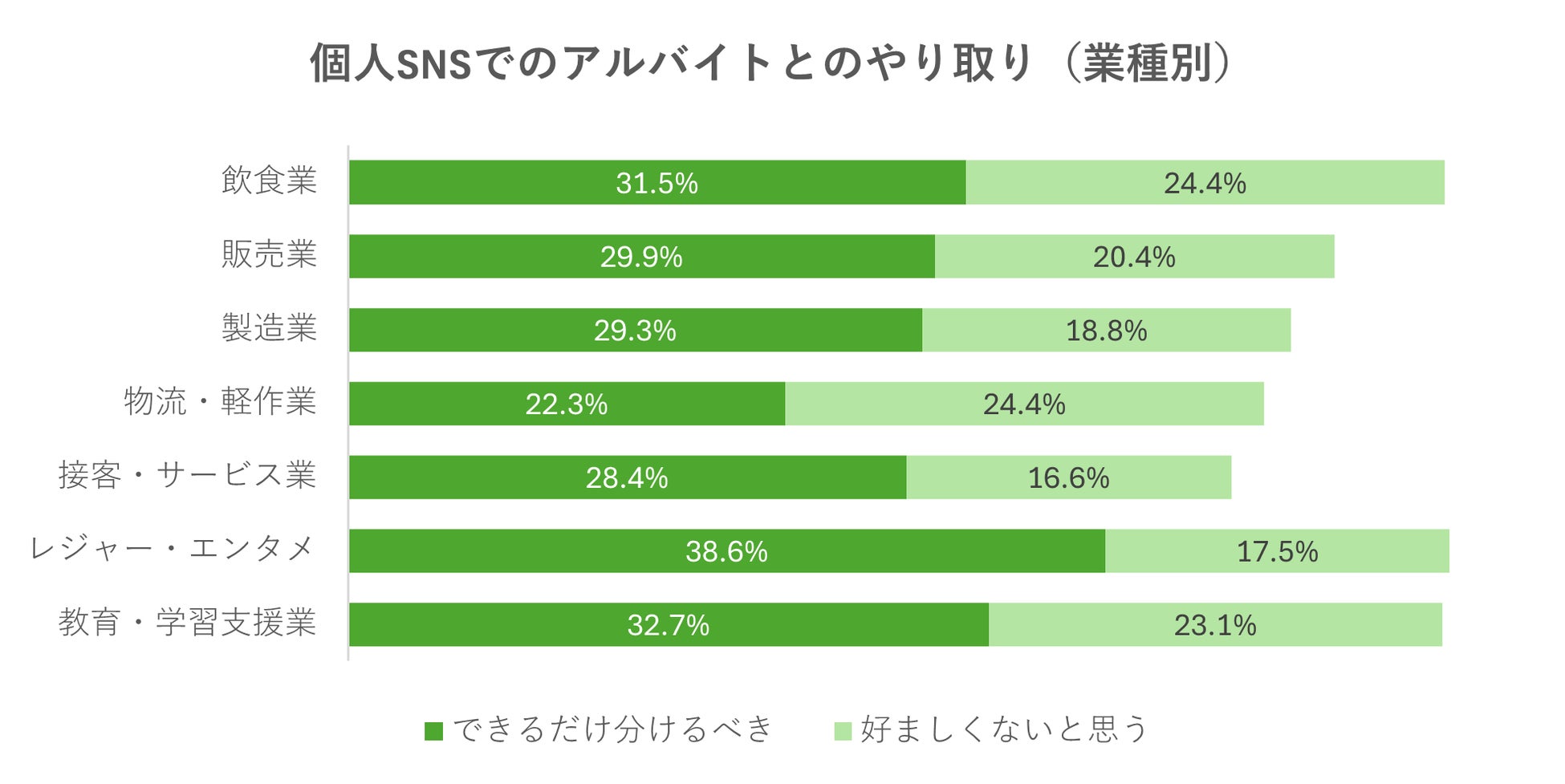 ・一方で、現実には主にLINEを中心とした個人SNSでのやり取りが幅広く行われており、最も割合の多かった飲食業では、ほぼ半数が個人SNSを介してアルバイトとやり取りしていると回答した
