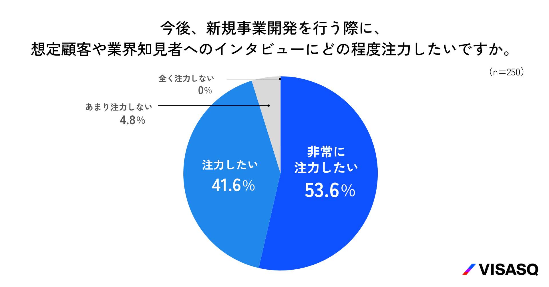今後、新規事業開発を行う際のインタビュー注力度を尋ねたところ、「非常に注力したい」が53.6%、「注力したい」が41.6%で、合わせて9割以上が注力したいと考えていることがわかりました(n=250)。