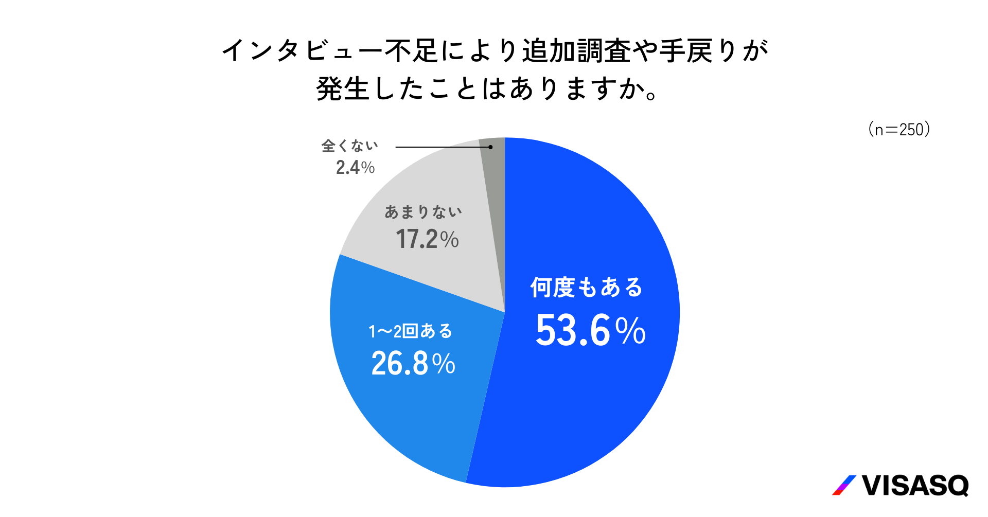 インタビュー不足による追加調査などの手戻り経験を尋ねたところ、「何度もある」が53.6%で最も多く、「1〜2回」が26.8%と続き、合わせて80.4%が手戻りを経験していることがわかりました。(n=250)。