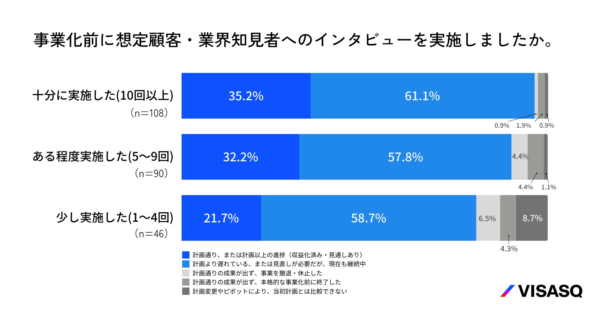 この結果から、インタビューを十分に実施している層ほど新規事業が計画通り進んでいる割合が高く、実施回数が少ない層では撤退・終了の割合が高い傾向が見られました。