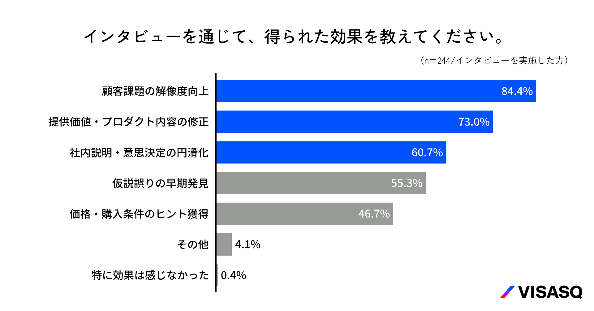 インタビューを通じて、得られた効果を尋ねたところ、「顧客課題の解像度が高まった」が84.4%で最も多く、「提供価値・プロダクト内容を修正できた」が73.0%、「社内説明・意思決定がスムーズになった」が60.7%と続きました(n=244/インタビューを実施した方※複数回答)。