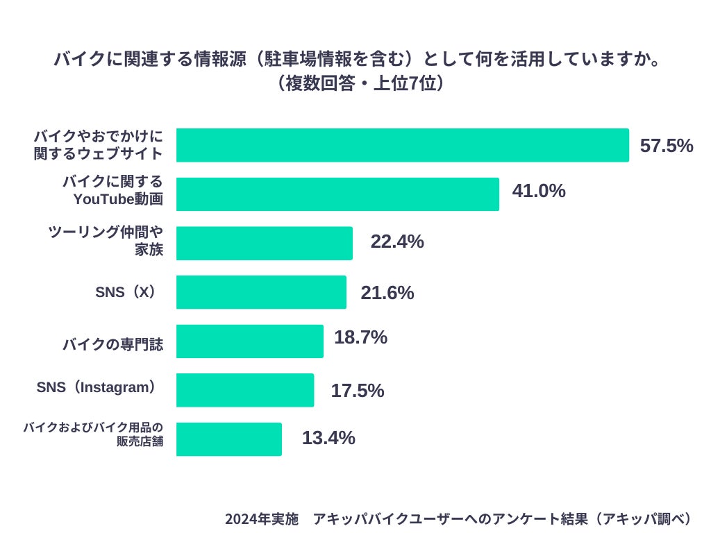 次に、バイクに関連する情報源として何を活用しているか聞いてみたところ、約6割の人が「バイクやおでかけに関するウェブサイト」 (57.5%)を利用しており、次いで「バイクに関するYouTube動画」(41.0%)という結果でした。インターネットを利用した情報収集が主流である一方で「ツーリング仲間や家族からの口コミ」 (22.4%)も一定数挙げられており、信頼できる身近な人からの口コミやアドバイスは、具体的で実用的な情報源として重宝されていることが伺えます。他にも「SNS(X)」(21.6%)、「SNS(Instagram)」(17.5%)が挙げられていることから、リアルタイムでの情報共有が重要視されていることが推測されます。
