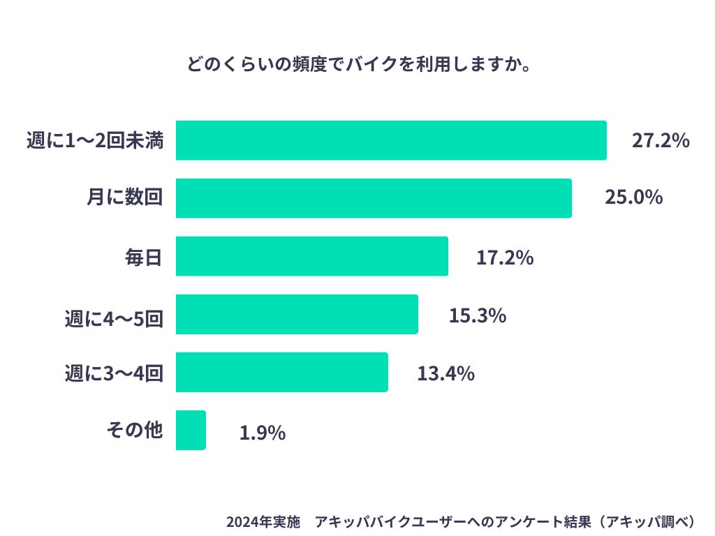 一方で、「毎日」(17.2%)「週に4〜5回」(15.3%)という回答数も一定数あり、バイクを頻繁に利用する層と、比較的少ない頻度で利用する層が存在していることがわかります。