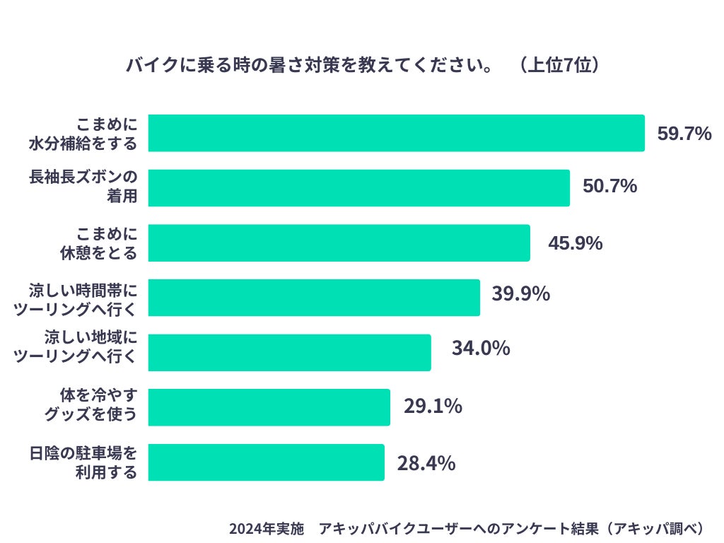 また、「涼しい時間帯にツーリングへ行く」(39.9%)や「涼しい地域にツーリングへ行く 」(34.0%)、「日陰の駐車場を利用する」(28.4%)などツーリング時の気温に関する対策をしている人も一定数いることがわかりました。