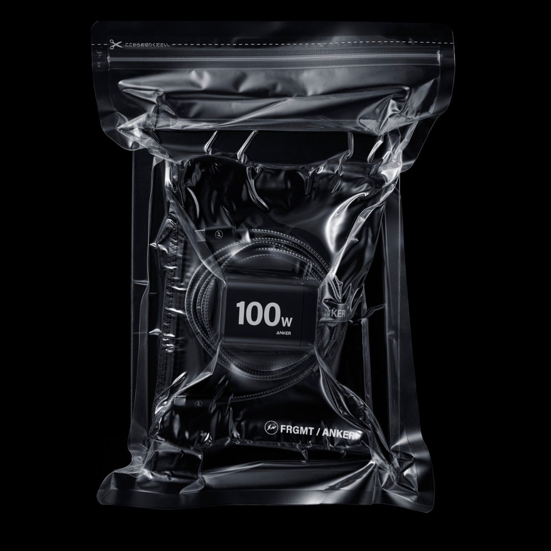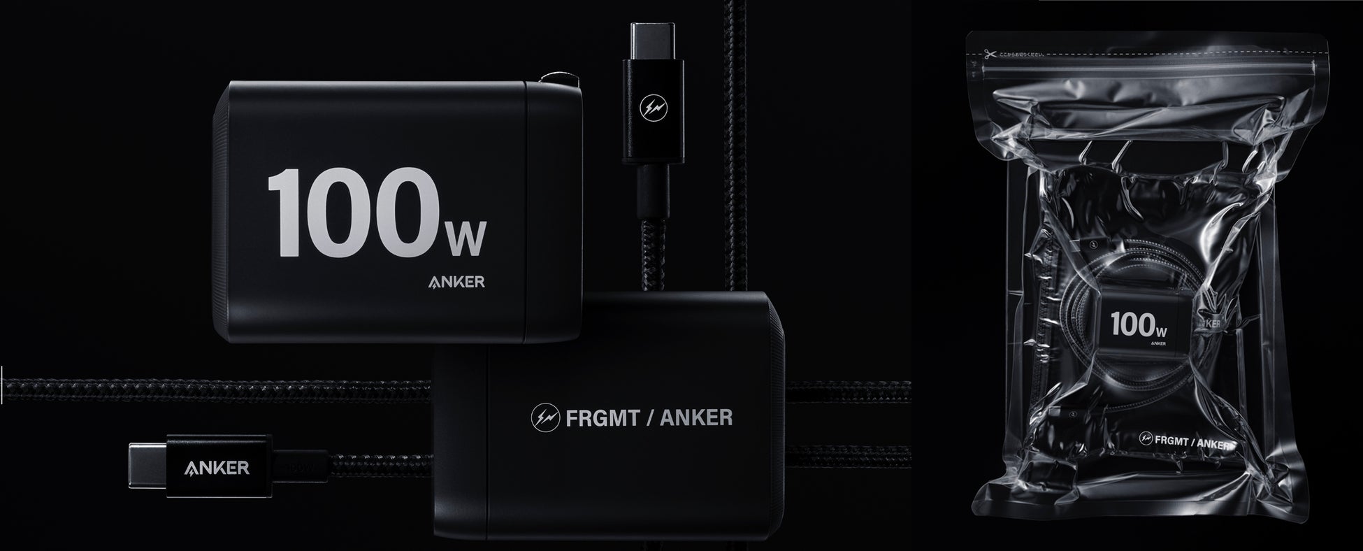 本コラボレーションは、藤原ヒロシ氏がこれまでのクリエイターとしての活動をする中で、外出先でのノートPCの充電用にAnker製品を愛用いただいていた経緯もあり実現した企画で、藤原ヒロシ氏と共同で製品選定やデザイン検討を行いました。fragmentとの特別なコラボモデルとして実際にクリエイターにも安心してお使いいただけるハイスペックな製品を選定し、こだわりのデザイン・カラーを施しました。ブラックにカラーリングを調整し、fragmentのロゴと稲妻デザインのAnkerの最高峰充電シリーズのUSB急速充電器「Anker Prime Wall Charger (100W, 3 ports, GaN)」と、同じく稲妻デザイン入りで100W出力に対応したケーブル、USB急速充電器とケーブルを合わせて持ち歩く際に最適なオリジナルポーチをセットにしました。外出先でノートPCを使用するカメラマンやデザイナー等の本物志向のクリエイターに最適なセレクトの製品を、本コラボレーションに合わせてfragmentの世界観を表す真空パックの特別包装でご用意致します。