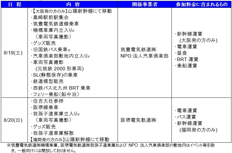ツアー代金は、大人39,800円(税込)、小学生以下34,800円(税込)で、西鉄旅行㈱のホームページにて7月4日(火)より予約受付を開始いたします。九州・関西それぞれの鉄道ファンの皆さまのご参加を心よりお待ちしております。