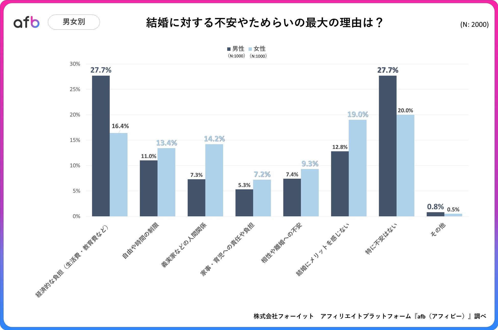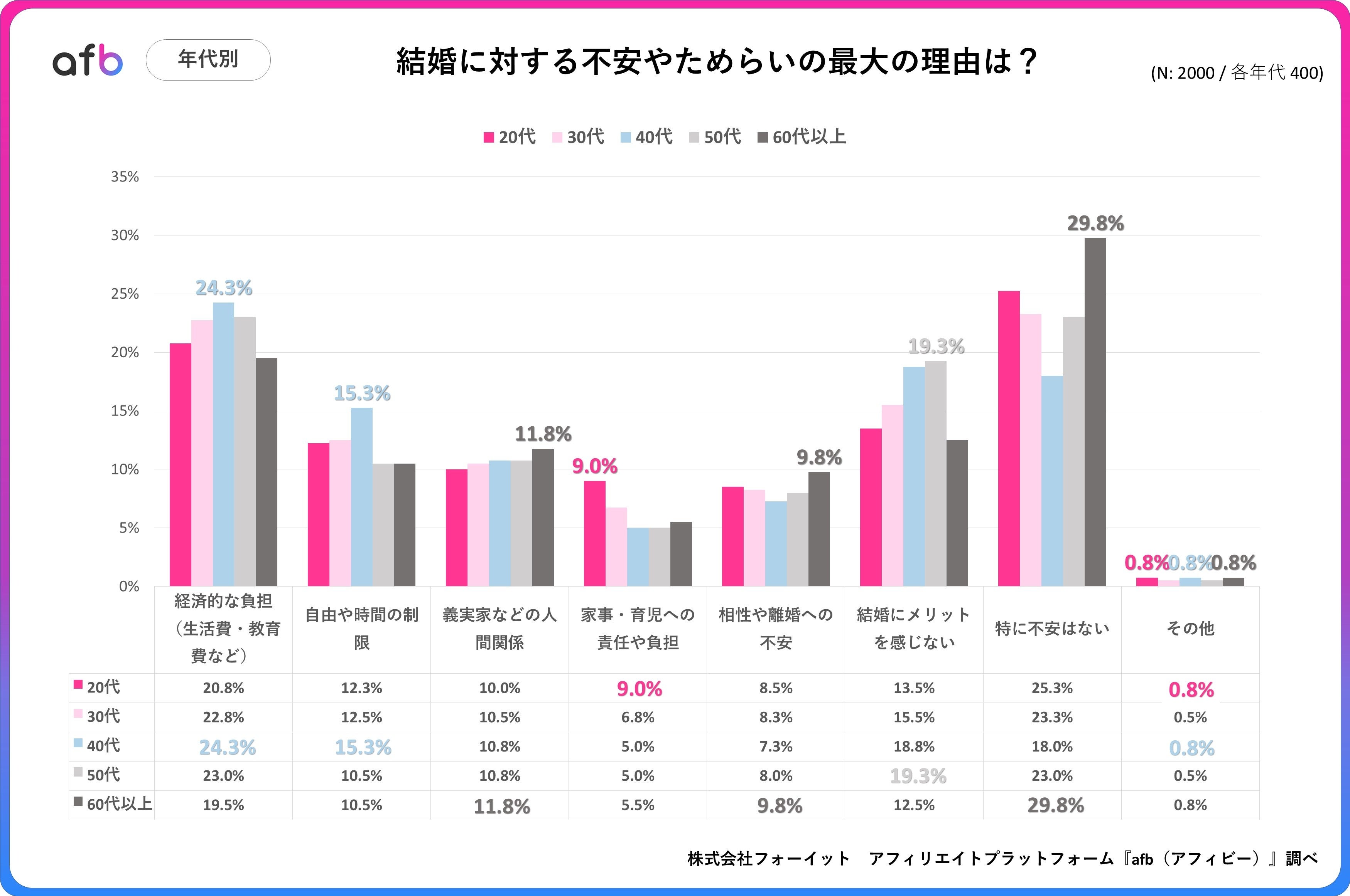 アフィリエイトプラットフォーム「afb(アフィビー)」< https://www.afi-b.com/ >の開発運用をおこなう株式会社フォーイットは、全国の20代~60代までの男女2,000人を対象に結婚観に関するアンケートを実施し、年代別等の特徴についてまとめました。