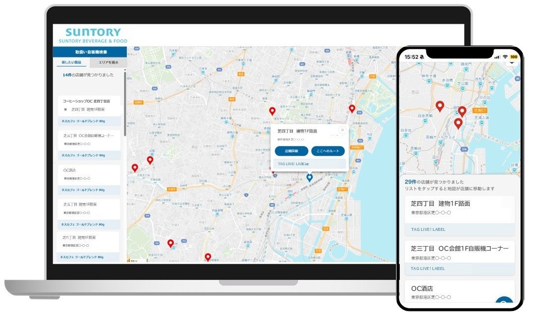 Mapion Biz「買えるお店マップ」サントリー食品インターナショナルが提供する「TAG LIVE ! LABEL」で導入