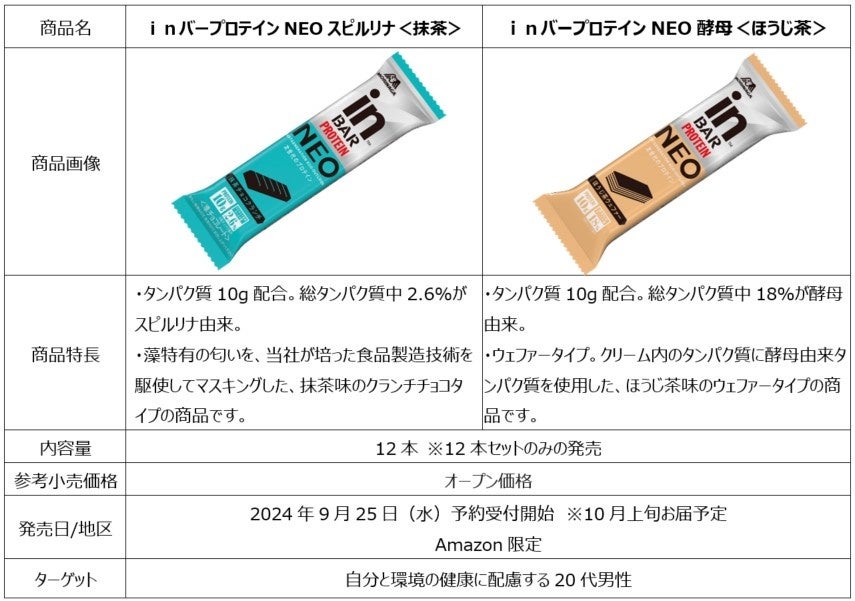 森永製菓株式会社(本社 : 東京都港区芝浦、代表取締役社長:太田 栄二郎)は、バータイプで手軽に美味しくタンパク質を補給できる「inバープロテイン」シリーズから、タンパク質危機という社会課題に向けた新しいタンパク質を使用した次世代のプロテインバー「inバープロテインNEO <スピルリナ>」「inバープロテインNEO <酵母>」をGlobal Goals Day(SDGsが採択された日)である9月25日(水)からAmazon限定で予約受付を開始いたします。