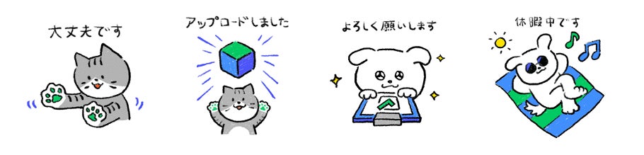 新しいブランドカラーや機能アイコンを取り入れたほか、「アップロードしました」「メールをしました」など業務連絡もサポートできる実用的なラインナップとなっています。