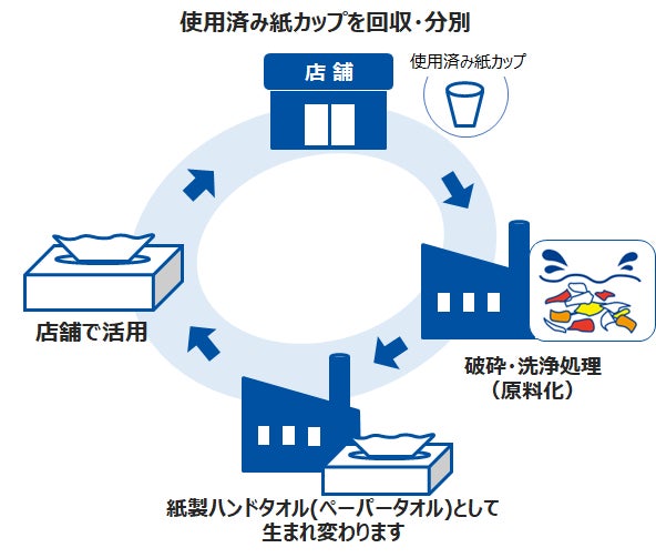 王子ホールディングスは各店舗から回収された紙カップに適切な処理を施したうえで紙製のハンドタオル(ペーパータオル)にリサイクルし、ふたたび各店舗で使用される予定です。