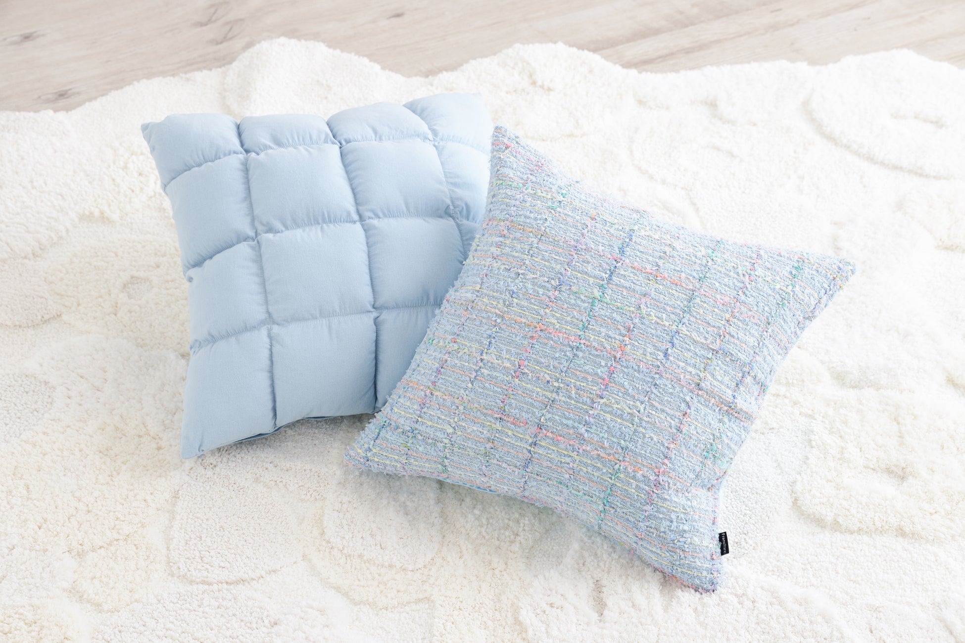 明るくやわらかなブルーがお部屋の差し色になるクッションカバーセットです。トレンドの “ぽこぽこ”キルト素材と、複数の色や素材をミックスして織り上げた表情豊かなツイードデザインを組み合わせ、お部屋の印象をさりげなくアップデート。素材感が引き立つコーディネートで、心地よい春のお部屋づくりをお楽しみください。