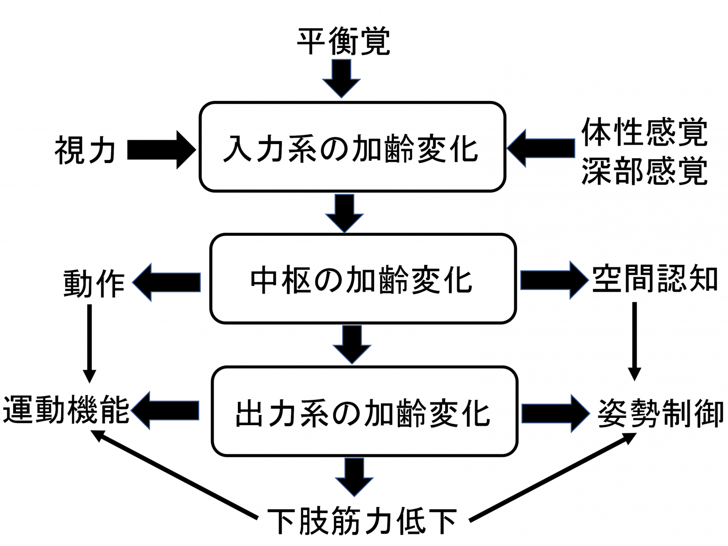 原因として、①内耳の平衡を司る三半規管などの平衡器官の両側の機能低下に加えて、②加齢性の視力低下による視覚の情報低下、③筋肉、靭帯、関節などの体の維持や歩行に必要な器官の加齢変化、④脳の加齢変化によるバランスの認知能力の低下、⑤睡眠障害やそれに伴う睡眠時無呼吸による脳の認知、内耳の平衡器官、網膜、筋肉などの機能低下などの要因が挙げられており、病態も非常に複雑になっています(右図)。また漫然と投薬されている抗めまい剤は眠気や認知機能障害を引き起こす場合もあります。