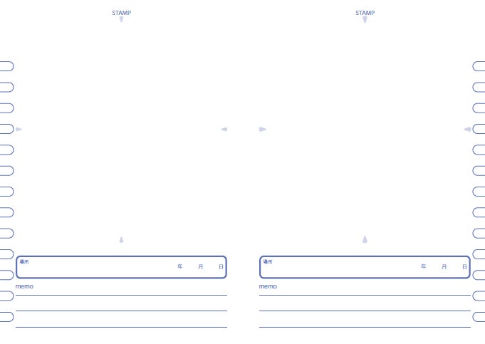 中面はスタンプと相性のいい、インクが映える上質紙を使用。スタンプ押印欄は、中央にキレイに押せるトンボ入りです。さらに、吸い取り紙も折り込まれて入っているため、対向ページに写らないようにできるのもポイントです。