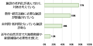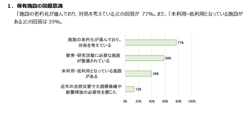 「施設の老朽化が進んでおり、対処を考えている」との回答が77%。また、「未利用・低利用となっている施設 がある」との回答は39%。