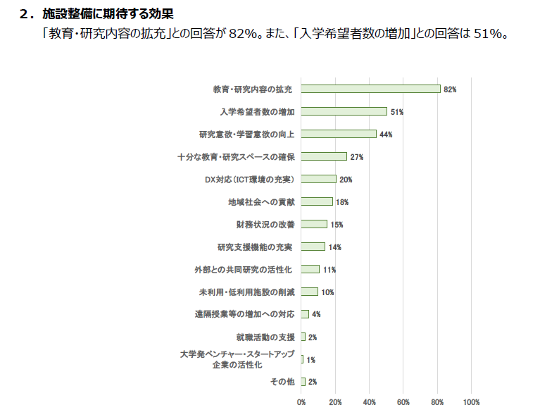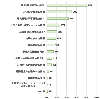 「教育・研究内容の拡充」との回答が82%。また、「入学希望者数の増加」との回答は51%。