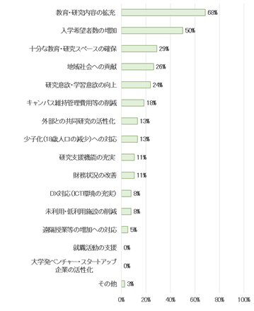 「教育・研究内容の拡充」との回答が68%。また、「入学希望者数の増加」との回答は50%。また、「地域社