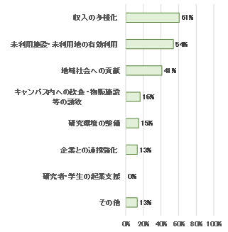 「収入の多様化」との回答が61%。また、「未利用施設・未利用地の有効活用」との回答が54%。