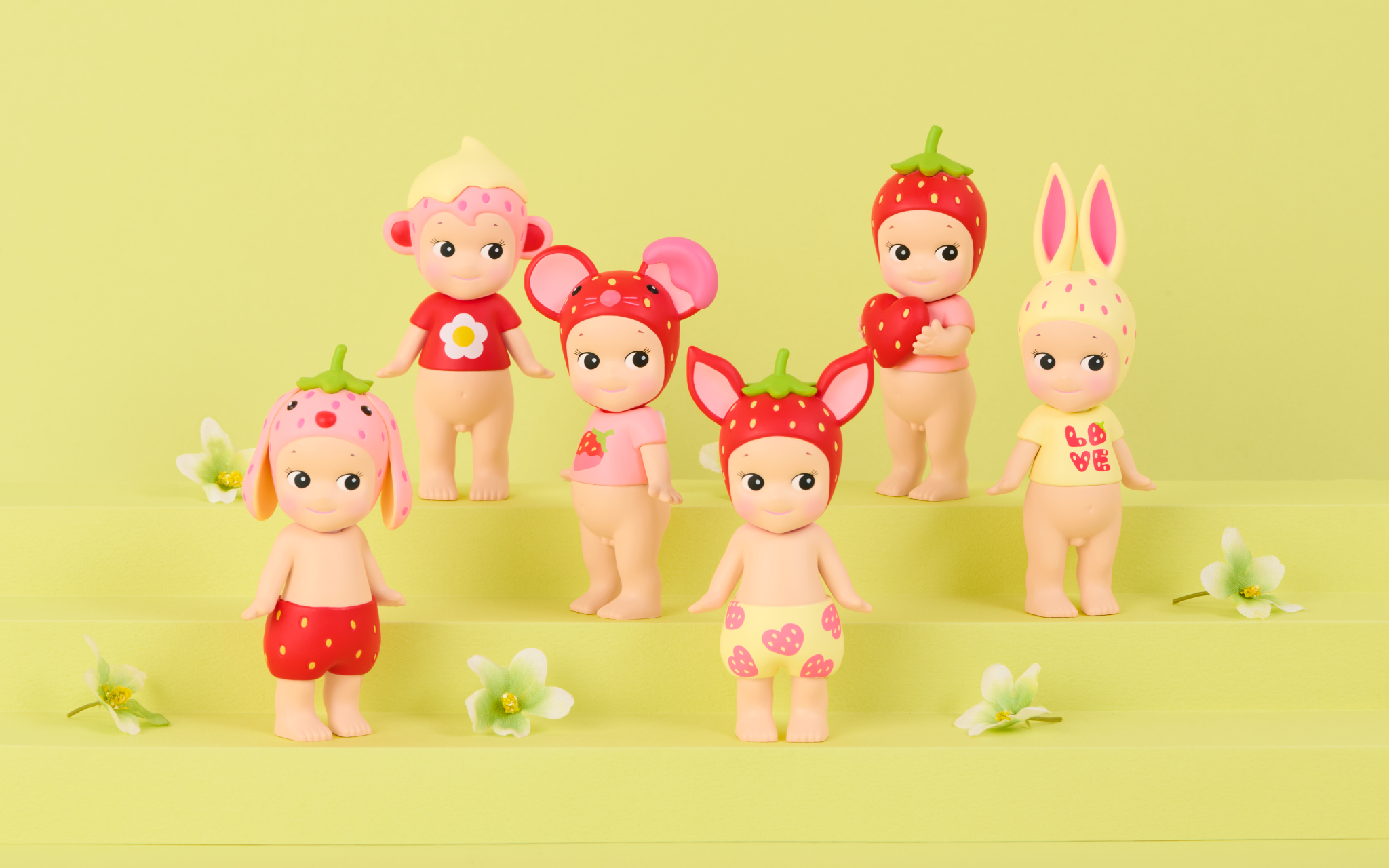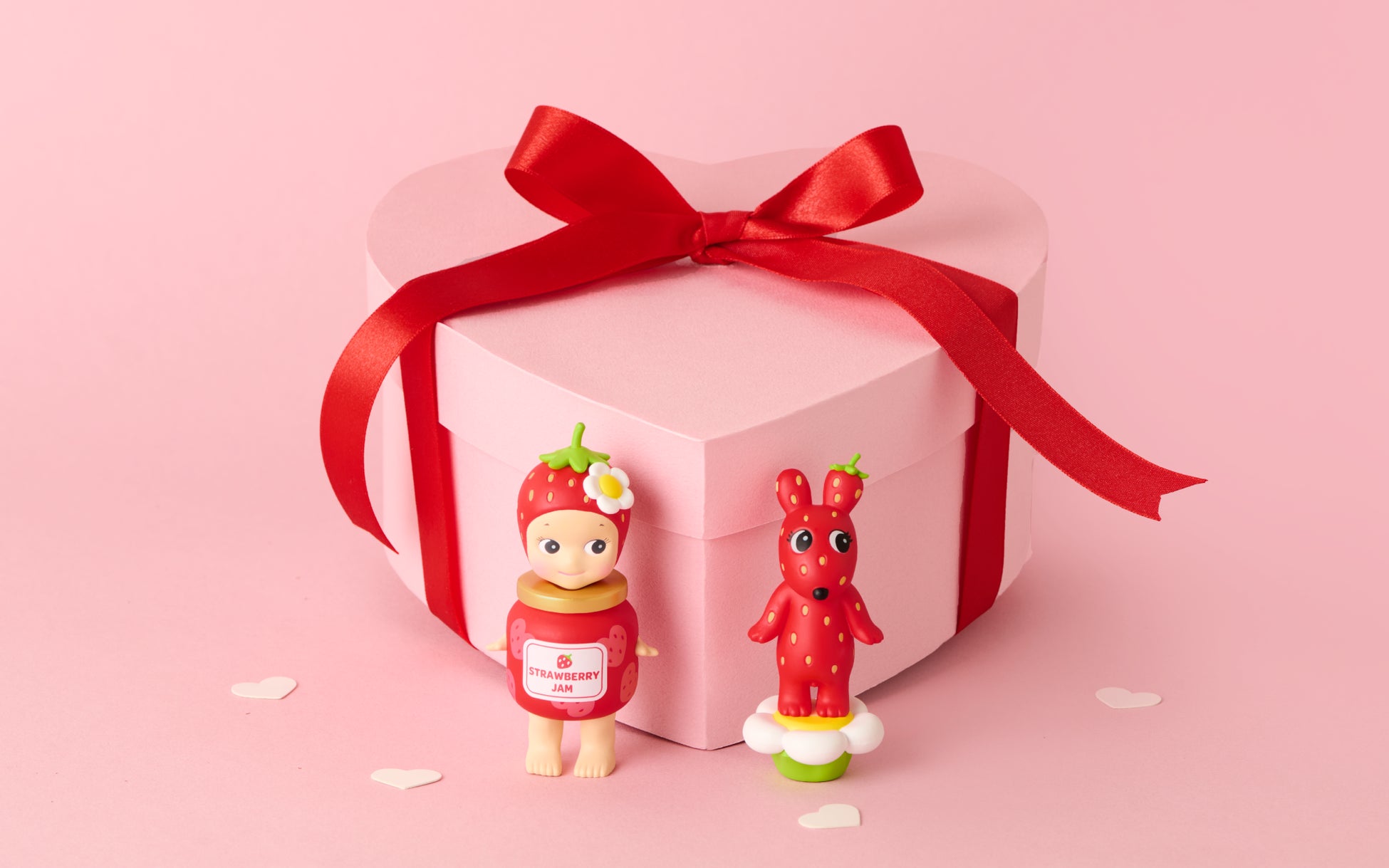 ハート型の果実を手にして、シンプルながらもまっすぐな愛を届けてくれる姿や、アニマルモチーフのSonny Angelが、ハートやいちご柄などのコスチュームをまとったキュートな姿で登場。