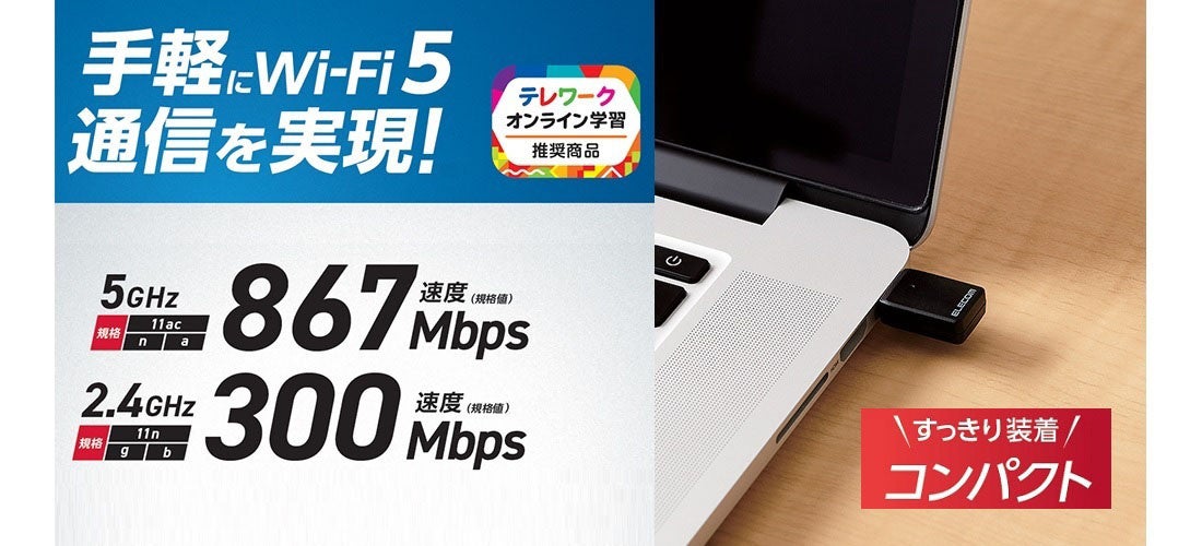 エレコム株式会社(本社:大阪市中央区、取締役社長:柴田幸生)は、ノートパソコンに接続することでWi-Fi 5を使った通信環境を手軽に実現できるコンパクトなWi-Fi 5(11ac)無線LANアダプターを12月上旬より新発売いたします。