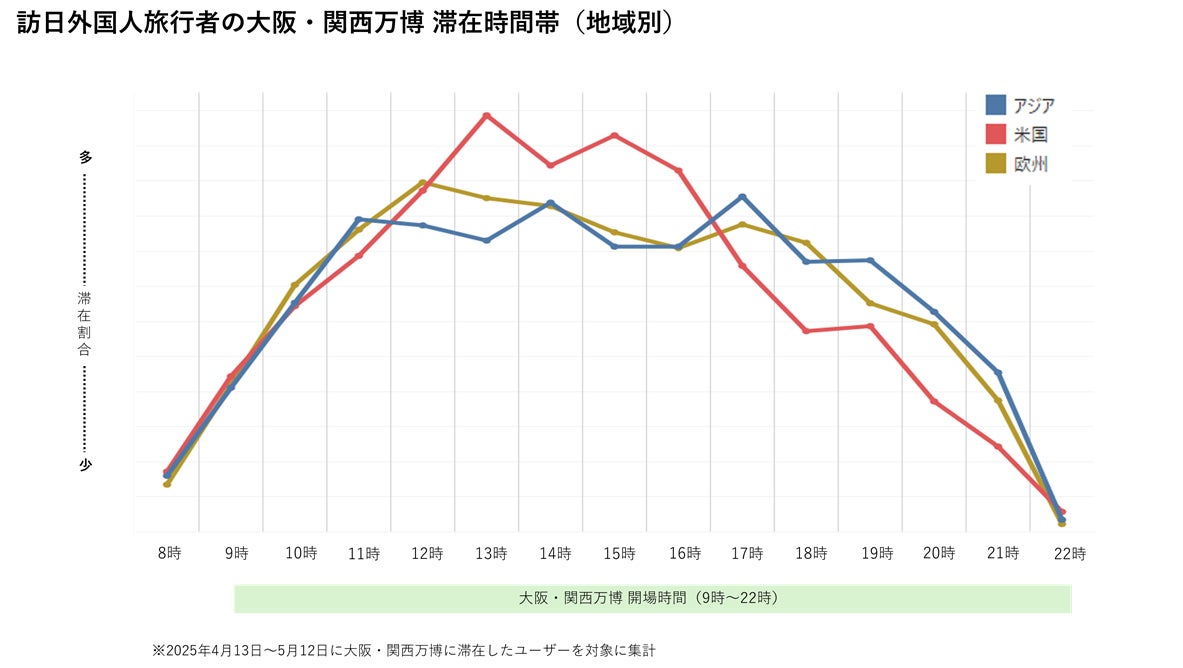 時間帯別の大阪・関西万博の地域別滞在傾向(アジア、米国、欧州)