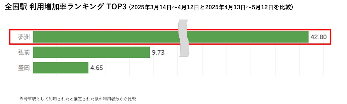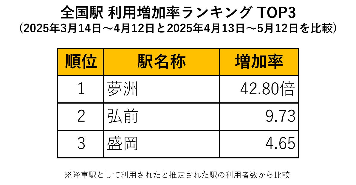 また、万博の開幕前後で全国の駅を対象に増加率を集計しました。その結果、大阪・関西万博会場の最寄り駅である夢洲駅が1位で42.80倍の伸びとなりました。例年4月中旬から5月上旬にかけて桜の見頃をむかえる東北の弘前駅、盛岡駅といった春の桜シーズンに多くの利用がある駅の増加率を大きく上回りました。