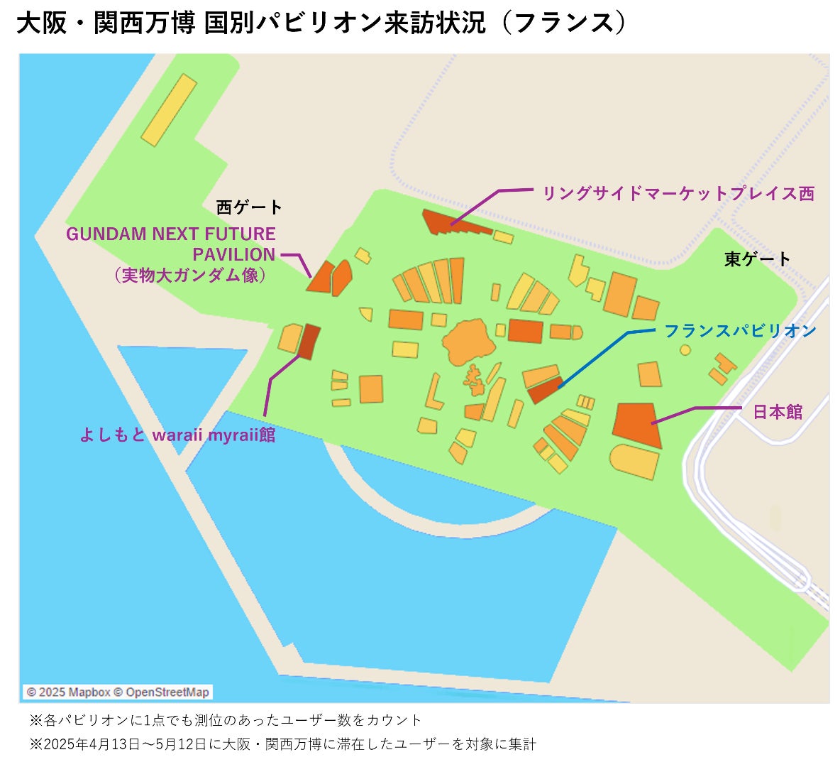 フランスからの旅行者は、自国のフランスパビリオンのほか、よしもと waraii myraii館での滞在が確認できます。ついでGUNDAM NEXT FUTURE PAVILION(実物大ガンダム像)、日本館、リングサイドマーケットプレイス西にも訪れており、タイと同様の傾向が見られます。