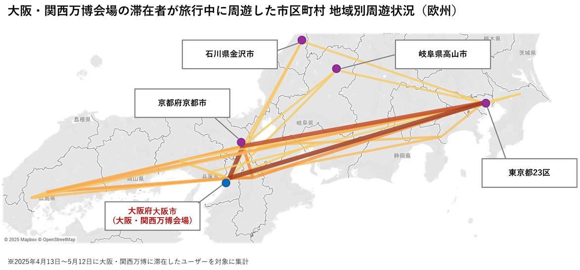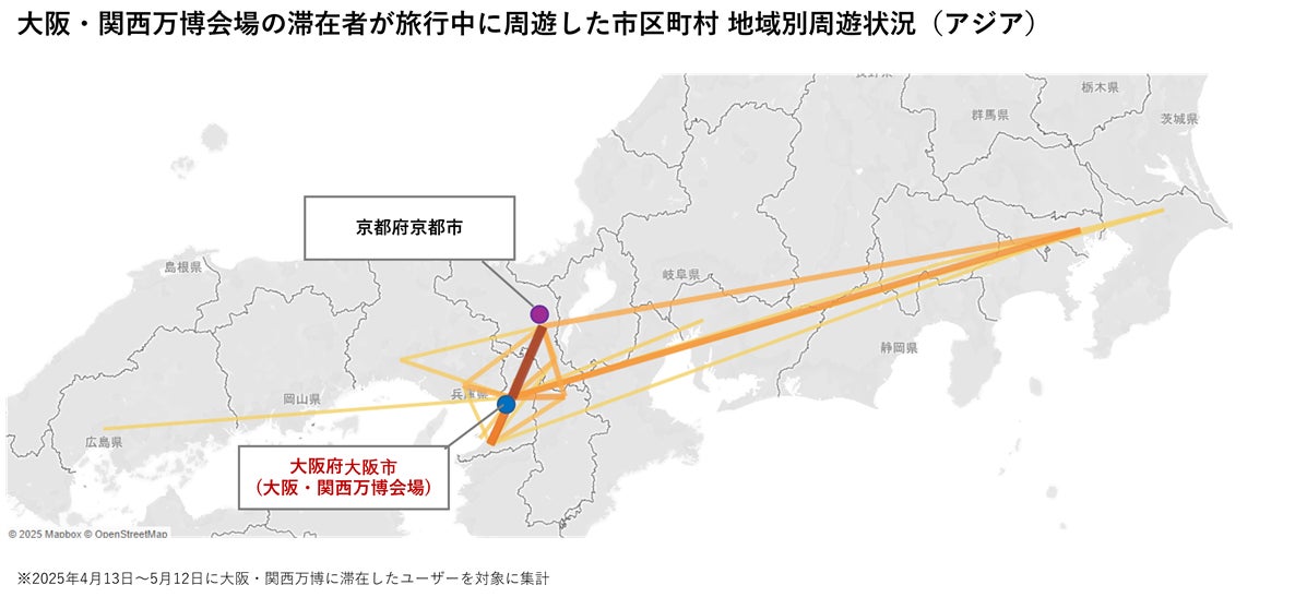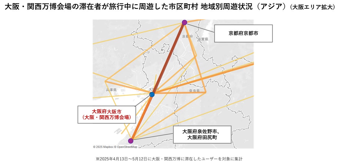 アジアでは、関西国際空港がある大阪府泉佐野市、田尻町、関西圏を中心とした万博会場周辺での周遊が見られます。特に大阪市-京都市間での周遊が最も多く、両市内の観光とあわせて大阪・関西万博も訪れていることが推察されます。