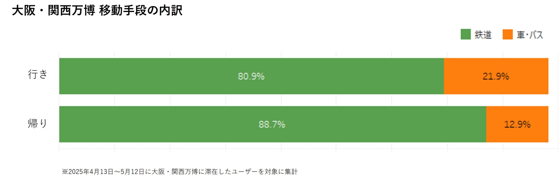 大阪・関西万博の会場への移動手段を分析しました。行き帰りともに、80%以上の訪日外国人旅行者が鉄道を利用していることがわかります。行きと帰りで比較すると、帰りの方が、鉄道利用者の割合が高い傾向にあります。大阪・関西万博は東ゲートが鉄道、西ゲートがバス等を利用するアクセス拠点となっていることから、帰りは東ゲートを利用する来場者が多いと推察されます。
