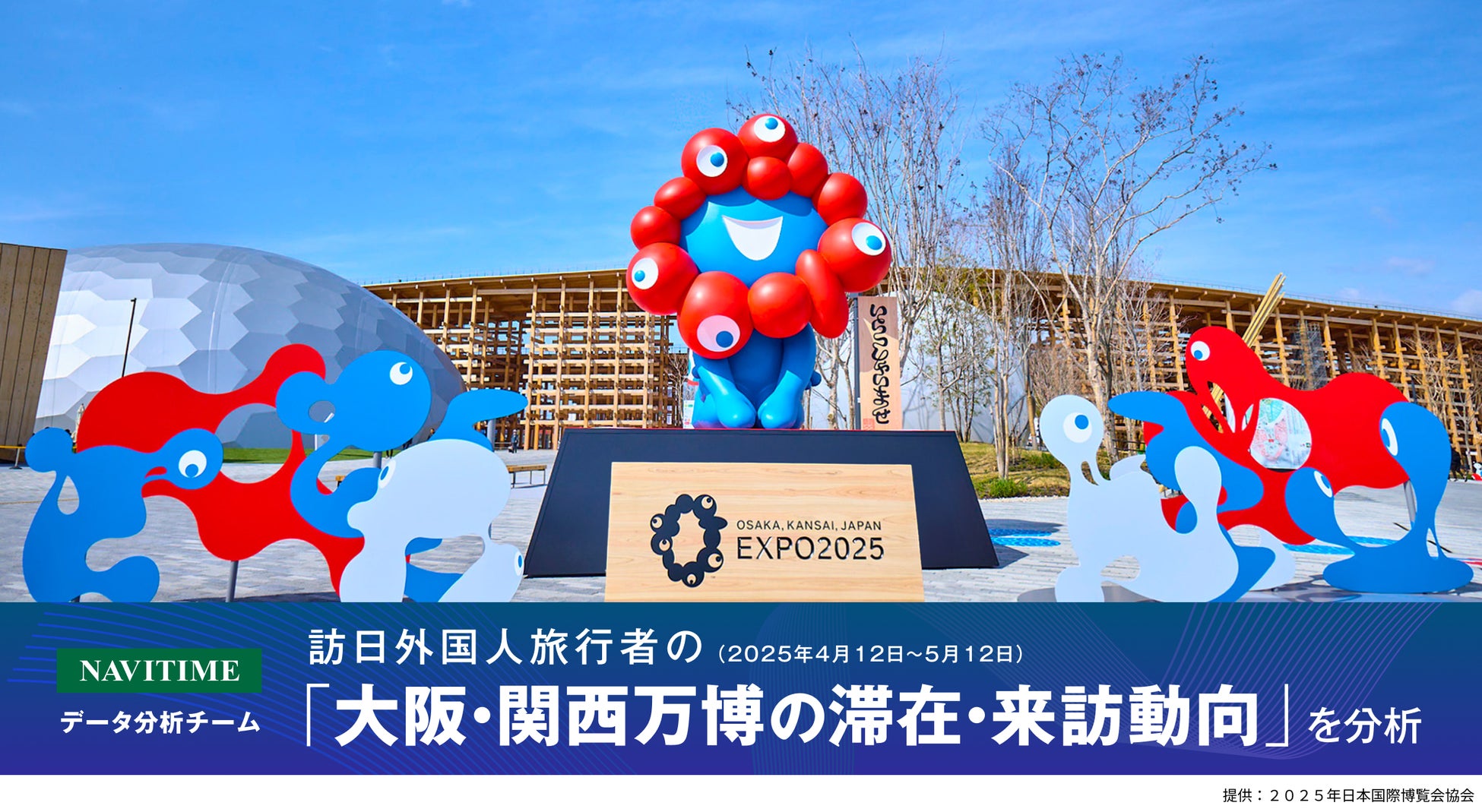 株式会社ナビタイムジャパン(代表取締役社長:大西 啓介、本社:東京都港区)のNAVITIMEデータ分析チームは、訪日外国人観光客向けのナビゲーションアプリ『Japan Travel by NAVITIME』の利用状況から、大阪・関西万博の開幕から1ヶ月間の訪日外国人旅行者による滞在・来訪状況の分析結果を発表いたします。