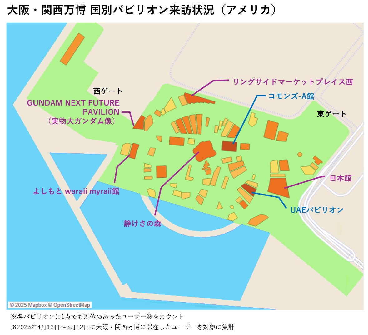 アメリカからの旅行者は、万博の会場内を全体的に幅広く回遊していることがわかります。そのなかでも、特にコモンズ-A館、UAEパビリオンへの滞在が多いことがうかがえます。