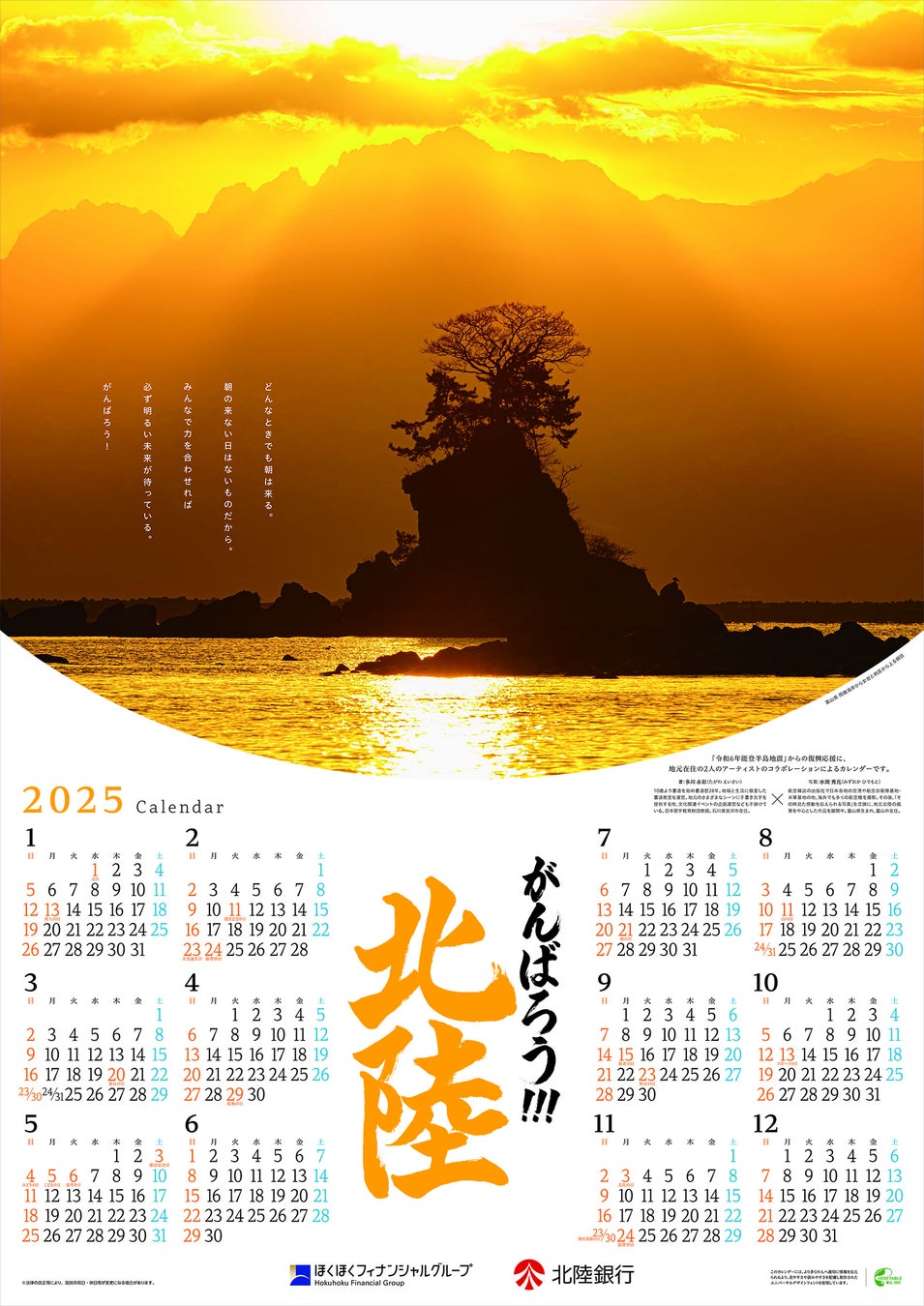 ほくほくフィナンシャルグループの北陸銀行(頭取 中澤 宏)は、2025年カレンダーとして、石川県金沢市在住の書道家多川永彩氏と富山県富山市在住の写真家 水岡秀元氏の作品「がんばろう!!!北陸」を作成しましたので、ご案内します。