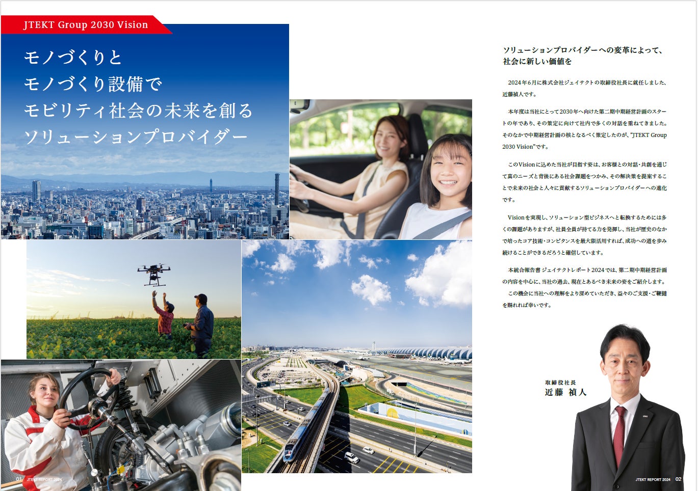 「ジェイテクトレポート2024」では、本年度発表したJTEKT Group 2030 Visionと第二期中期経営計画の概要について、あらたに社長に就任した近藤ほか当社経営陣の声を通して語り、社会課題の解決を提供する“ソリューションプロバイダー”への変革を、どのように成し遂げようとしているのかを重点的に紹介しております。
