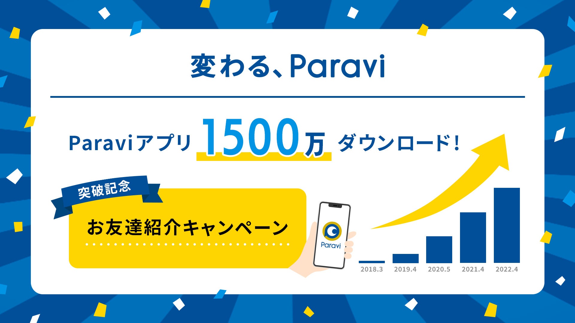 動画配信サービス「Paravi」( https://www.paravi.jp/ )をスマートフォンなどでご利用いただくためのアプリのダウンロード数が、累計で1500万件を超えました。 過去1年に500万ダウンロード上積みされ、サービス開始4年での達成となります。大台突破を記念し、Paraviでは本日「お友達紹介キャンペーン」を開始しました。