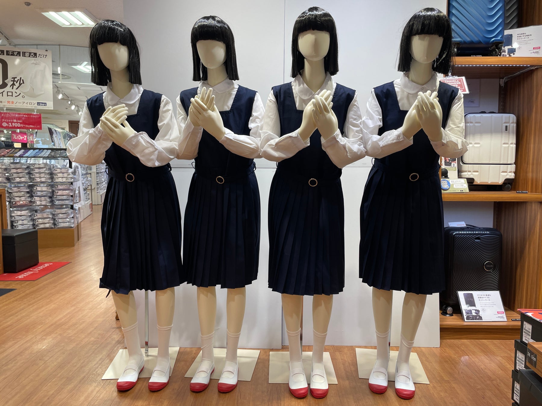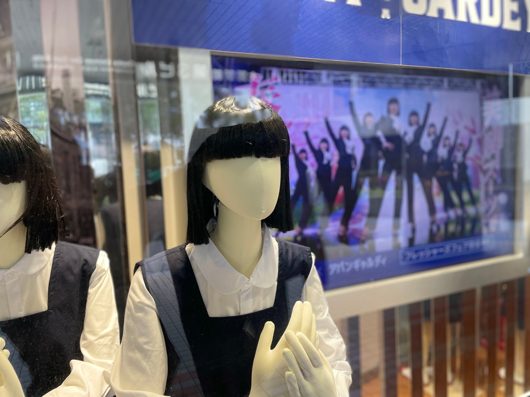 アバンギャルディ担当ヘアメイクがカットしたおかっぱウィッグに、おなじみの制服を着用したマネキンを設置。CMと連動したポーズを取っています。