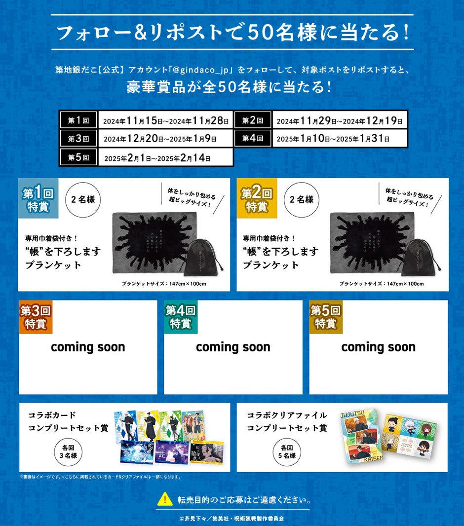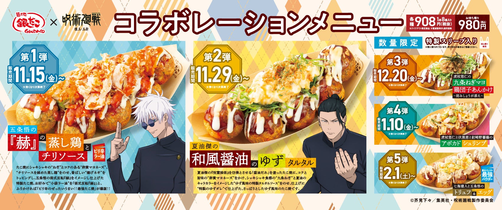 国内外に 「築地銀だこ」https://www.gindaco.com/ を展開する株式会社ホットランド https://hotland.co.jp/ (本社:東京都中央区、代表取締役社長:佐瀬守男)は、2024年11月15日(金)から2025年2月14日(金)までの期間、全国の築地銀だこ店舗(一部店舗を除く)にて、TVアニメ 『呪術廻戦』 2期 「懐玉・玉折 / 渋谷事変」 とのコラボレーションを実施いたします!