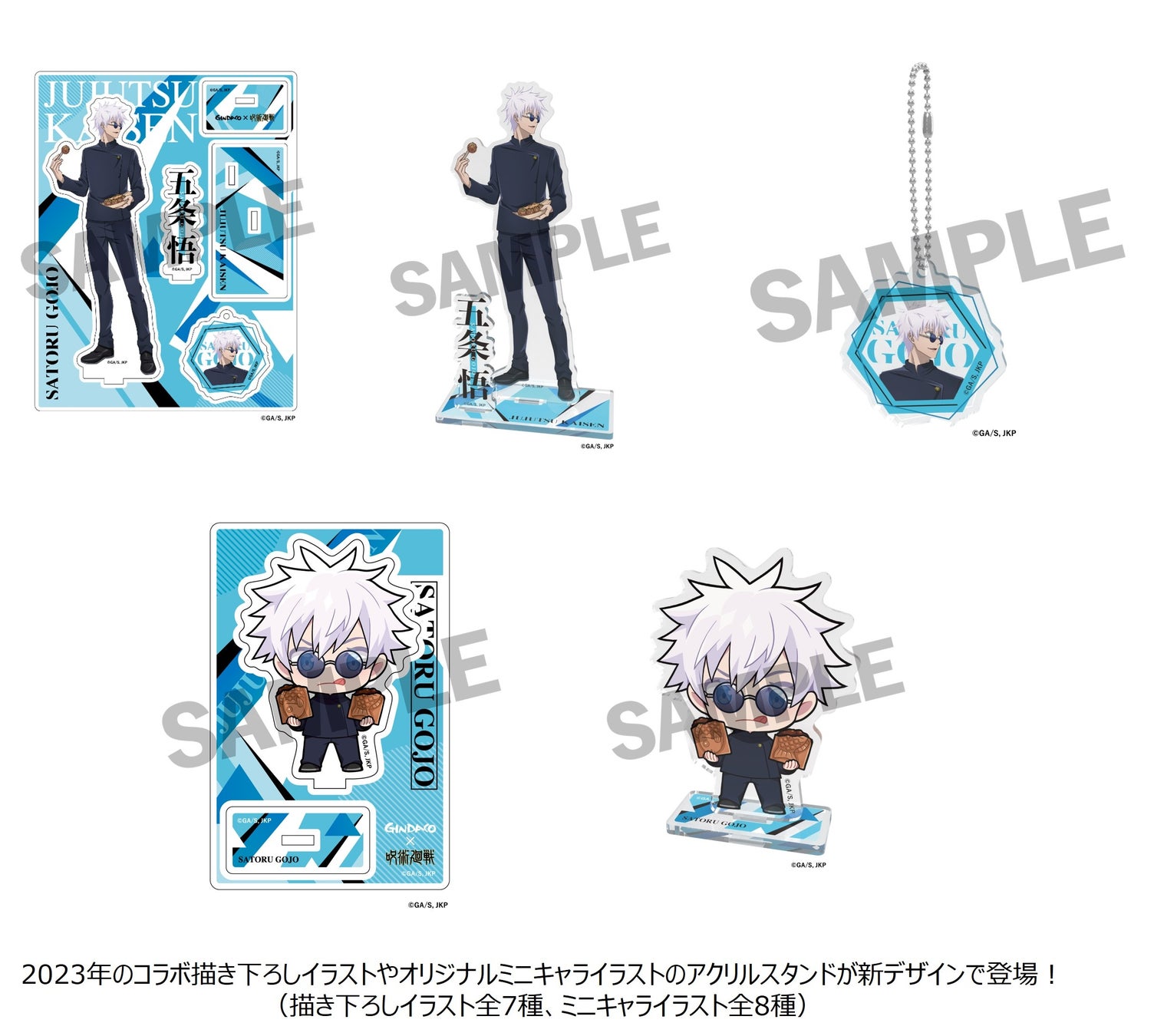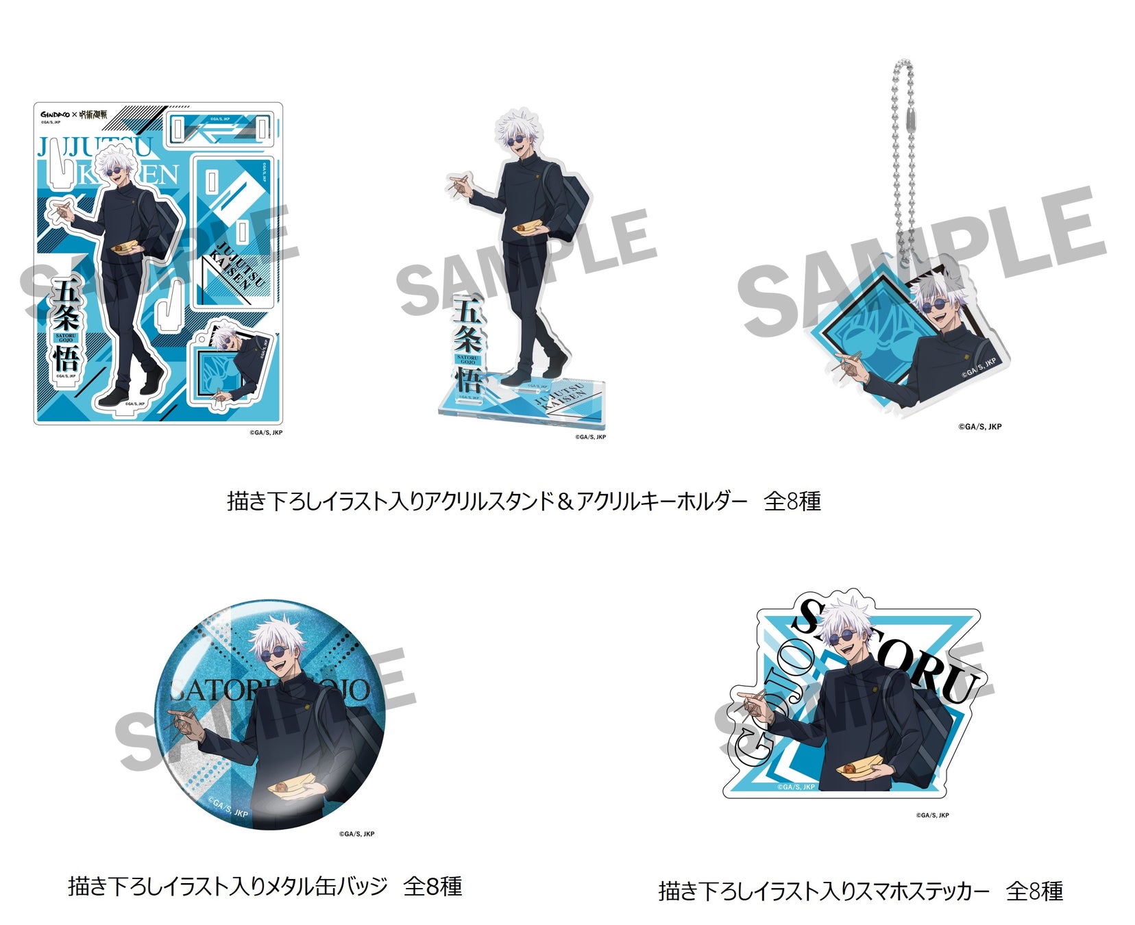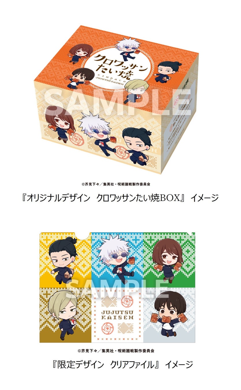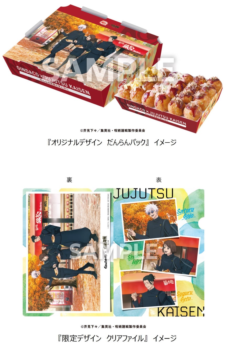 今回のコラボレーションでは、登場キャラクターの五条悟らをイメージした 『コラボたこ焼(8個入り)、特製スリーブ、限定コラボカード付』 や、オリジナルデザイン 『だんらんパック(24個入り)、限定デザインクリアファイル付』 に加え、オリジナルデザイン 『クロワッサンたい焼BOX(6匹入り)、限定デザイン クリアファイル付』 の販売や、各社宅配サービスでは 『オリジナルデザインBOX入り & 限定デザイン クリアファイル』 を販売いたします。